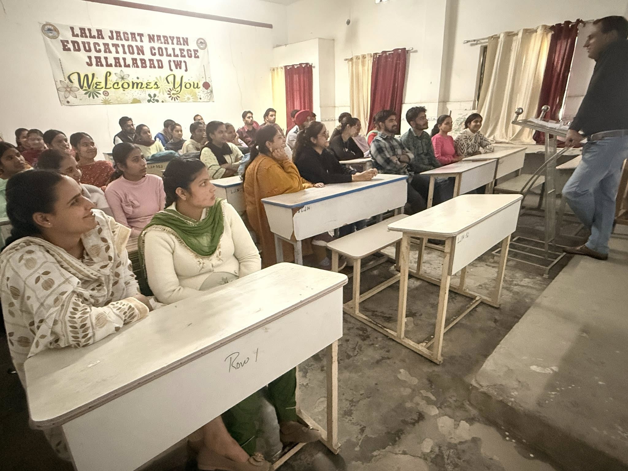 ਸਥਾਨਕ ਲਾਲਾ ਜਗਤ ਨਾਰਾਇਣ ਐਜੁਕੇਸ਼ਨ ਕਾਲਜ ਜਲਾਲਾਬਾਦ ਪੱਛਮੀ ਵਿਖੇ ਮੈਨੇਜਮੈਂਟ ਕਮੇਟੀ ਦੇ ਚੇਅਰਮੈਨ ਸ੍ਰੀ ਅਸ਼ੋਕ ਕੁਮਾਰ ਅਨੇਜਾ ਜੀ, ਪ੍ਰਧਾਨ ਸ੍ਰੀ ਪ੍ਰਦੀਪ ਕੁਮਾਰ ਚੁੱਘ ਜੀ, ਖਜ਼ਾਨਚੀ ਸ੍ਰੀ ਚੰਦਰ ਸ਼ੇਖਰ ਗੂੰਬਰ ਜੀ, ਸਿਖਿਆ ਸ਼ਾਸਤਰੀ ਸਰਦਾਰ ਗੁਰਬਖਸ਼ ਸਿੰਘ ਖੁਰਾਣਾ ਜੀ, ਪ੍ਰਿੰਸੀਪਲ ਡਾ ਨੀਤਿਕਾ ਜੀ ਦੀ ਯੋਗ ਅਗਵਾਈ ਹੇਠ ਕਾਲਜ ਵਿੱਚ ਪੰਜਾਬੀ ਲੋਕ ਗੀਤਾਂ ਦਾ ਸੱਭਿਆਚਾਰ ਉੱਤੇ ਪ੍ਰਭਾਵ ਤੇ ਐਕਸਟੈਨਸ਼ਨ ਲੈਕਚਰ ਕਰਵਾਇਆ ਗਿਆ ਜਿਸ ਵਿੱਚ ਸਹਾਇਕ ਪ੍ਰੋਫ਼ੈਸਰ ਮਿਸਟਰ ਪ੍ਰੈਮ ਲਾਲ ਡੇ.ਏ.ਵੀ ਕਾਲਜ ਜਲਾਲਾਬਾਦ ਪੱਛਮੀ ਤੋਂ ਉੱਘੇ ਤੌਰ ਤੇ ਪਹੁੰਚੇ। ਉਨ੍ਹਾਂ ਨੇ ਪੰਜਾਬੀ ਲੋਕ ਗੀਤਾਂ ਦਾ ਸੱਭਿਆਚਾਰ ਉੱਤੇ ਪ੍ਰਭਾਵ ਦੇ ਮੱਹਤਵ ਬਾਰੇ ਵਿਦਿਆਰਥੀਆਂ ਨਾਲ ਜਾਣਕਾਰੀ ਸਾਂਝੀ ਕੀਤੀ। ਉਨ੍ਹਾਂ ਨੇ ਕਿਹਾ ਕਿ ਪੰਜਾਬੀ ਲੋਕ ਗੀਤ ਸਾਡੀ ਸੱਭਿਆਚਾਰ ਦੀ ਰੂਹ ਹੈ ਜੋ ਜਨਮ ਤੋਂ ਲੈ ਕੇ ਮੌਤ ਤੱਕ ਦੇ ਜੀਵਨ ਚੱਕਰ ਅਤੇ ਮੌਸਮੀ ਤਿਉਹਾਰਾਂ ਨੂੰ ਦਰਸਾਉਂਦੀ ਹੈ ਜੋਂ ਨਾਲ ਹੀ ਪੰਜਾਬੀ ਸਮਾਜ ਦੀਆਂ ਰੀਤਾਂ, ਪੰਰਪਰਾਵਾਂ ਅਤੇ ਭਾਈਚਾਰਕ ਸਾਂਝ ਨੂੰ ਮਜ਼ਬੂਤ ਕਰਦੀ ਹੈ। ਆਧੁਨਿਕੀਕਰਨ ਅਤੇ ਪੱਛਮੀ ਸੰਗੀਤ ਦੇ ਪ੍ਰਭਾਵਾਂ ਕਾਰਨ ਲੋਕ ਗੀਤਾਂ ਦੀ ਮੂਲ ਤਰਜ਼ ਖਤਮ ਹੋ ਰਹੀ ਹੈ। ਇਹਨਾਂ ਨੂੰ ਸੰਭਾਲਣਾ ਅਤੇ ਅਗਲੀ ਪੀੜ੍ਹੀ ਤੱਕ ਪਹੁੰਚਾਉਣਾ ਸਾਡੀ ਸਾਂਝੀ ਜ਼ਿੰਮੇਵਾਰੀ ਹੈ, ਤਾਂ ਜੋਂ ਪੰਜਾਬੀ ਸੱਭਿਆਚਾਰ ਦੀ ਪਛਾਣ ਬਣੀ ਰਹੇ। ਇਸ ਮੌਕੇ ਕਾਲਜ ਦੇ ਪ੍ਰਿੰਸੀਪਲ ਡਾਂ ਨੀਤਿਕਾ ਜੀ ਨੇ ਮਿਸਟਰ ਪ੍ਰੈਮ ਲਾਲ ਜੀ ਦਾ ਸਨਮਾਨ ਚਿੰਨ੍ਹ ਦੇ ਕੇ ਧੰਨਵਾਦ ਕੀਤਾ ਤੇ ਨਵੀਂ ਪੀੜ੍ਹੀ ਨੂੰ ਆਪਣੀ ਵਿਰਾਸਤ ਤੋਂ ਜਾਣੂ ਕਰਵਾਉਣ ਲਈ ਲੋਕ ਗੀਤਾਂ ਨੂੰ ਮੁੜ ਸੁਰਜੀਤ ਕਰਨ ਲਈ ਪ੍ਰੇਰਿਤ ਕੀਤਾ।