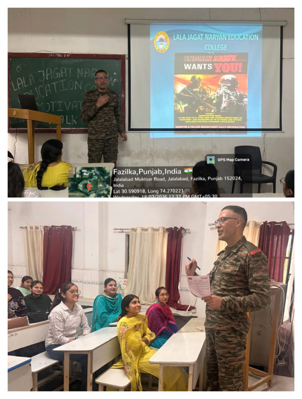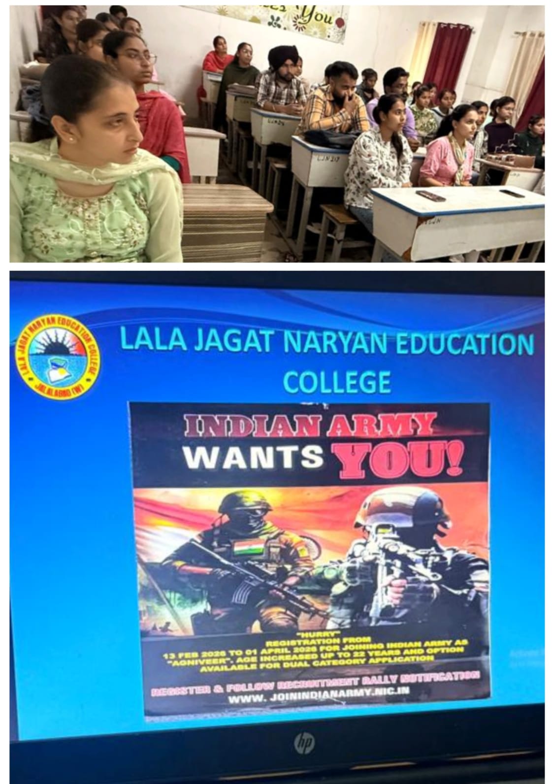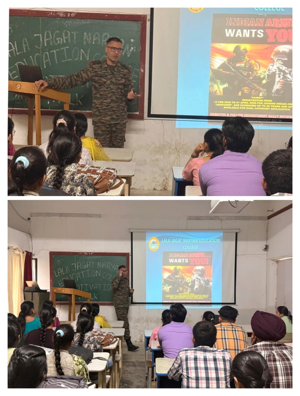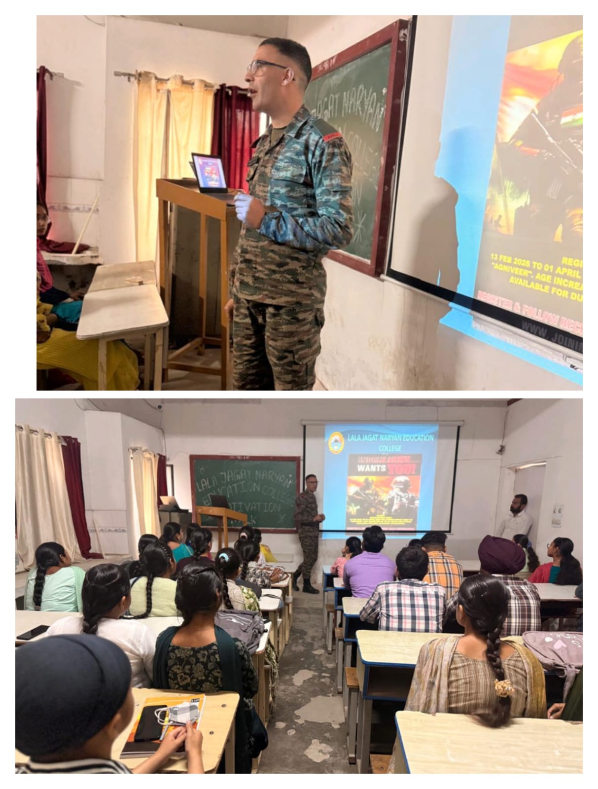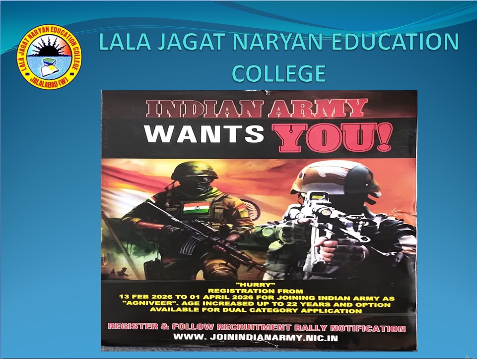 ਸਥਾਨਕ ਲਾਲਾ ਜਗਤ ਨਾਰਾਇਣ ਐਜੁਕੇਸ਼ਨ ਕਾਲਜ ਜਲਾਲਾਬਾਦ ਪੱਛਮੀ ਵਿਖੇ ਮੈਨੇਜਮੈਂਟ ਕਮੇਟੀ ਦੇ ਚੇਅਰਮੈਨ ਸ੍ਰੀ ਅਸ਼ੋਕ ਕੁਮਾਰ ਅਨੇਜਾ ਜੀ, ਪ੍ਰਧਾਨ ਸ੍ਰੀ ਪ੍ਰਦੀਪ ਕੁਮਾਰ ਚੁੱਘ ਜੀ, ਖਜ਼ਾਨਚੀ ਸ੍ਰੀ ਚੰਦਰ ਸ਼ੇਖਰ ਗੂੰਬਰ ਜੀ, ਸਿਖਿਆ ਸ਼ਾਸਤਰੀ ਸਰਦਾਰ ਗੁਰਬਖਸ਼ ਸਿੰਘ ਖੁਰਾਣਾ ਜੀ, ਪ੍ਰਿੰਸੀਪਲ ਡਾ ਨੀਤਿਕਾ ਜੀ ਦੀ ਯੋਗ ਅਗਵਾਈ ਹੇਠ ਕਾਲਜ ਵਿੱਖੇ 18/03/2026 ਨੂੰ ਵਿਦਿਆਰਥੀਆਂ ਦੇ ਲਈ ਅਗਨੀਵੀਰ ਯੋਜਨਾ ਤੇ ਇੱਕ ਪ੍ਰੇਰਨਾਦਾਇਕ ਲੈਕਚਰ ਦਾ ਆਯੋਜਨ ਕੀਤਾ ਗਿਆ। ਜਿਸ ਵਿੱਚ ਭਾਰਤੀ ਸੈਨਾ ਦੇ ਮੁੰਹਮਦ ਸਿਕੰਦਰ ਖਾਨ ਉੱਘੇ ਤੌਰ ਤੇ ਪਹੁੰਚੇ। ਉਨ੍ਹਾਂ ਨੇ ਵਿਦਿਆਰਥੀਆਂ ਨੂੰ ਅਗਨੀਵੀਰ ਯੋਜਨਾ ਬਾਰੇ ਜਾਣਕਾਰੀ ਦਿੰਦਿਆਂ ਹੋਇਆਂ ਕਿਹਾ ਕਿ ਇਹ ਭਾਰਤੀ ਫੌਜ ਵਿੱਚ ਨੌਜਵਾਨਾਂ ਨੂੰ 4 ਸਾਲ ਲਈ ਭਰਤੀ ਕਰਨ ਦੀ ਯੋਜਨਾ ਹੈ। ਇਸ ਦਾ ਉਦੇਸ਼ ਭਾਰਤੀ ਸੈਨਾ ਵਿੱਚ ਨੌਜਵਾਨਾਂ ਨੂੰ ਮੌਕਾ ਦੇਣਾ ਅਤੇ ਫੌਜ ਨੂੰ ਆਧੁਨਿਕ ਅਤੇ ਜਵਾਨ ਬਣਾਉਣਾ ਹੈ। ਇਸ ਯੋਜਨਾ ਅਧੀਨ 4 ਸਾਲਾ ਦੀ ਸੇਵਾ ਤੋਂ ਬਾਅਦ ਕਾਬਲੀਅਤ ਦੇ ਆਧਾਰ ਤੇ 25% ਅਗਨੀ ਵੀਰਾ ਸਥਾਈ ਰੂਪ ਵਿੱਚ ਫੌਜ ਵਿੱਚ ਰੱਖਿਆ ਜਾ ਸਕਦਾ ਹੈ ਤੇ ਬਾਕੀ 75% ਸੇਵਾ ਮੁਕਤ ਅਗਨੀ ਵੀਰਾ ਨੂੰ ਪੰਜਾਬ ਅਤੇ ਕੇਂਦਰ ਸਰਕਾਰ ਦੇ ਕਈ ਵਿਭਾਗਾਂ ਵਿੱਚ ਕੋਟਾਂ ਪ੍ਰਾਪਤ ਹੁੰਦਾ ਹੈ। ਵਿਦਿਆਰਥੀਆਂ ਨੇ ਬੜੇ ਉਤਸ਼ਾਹ ਨਾਲ ਇਸ ਲੈਕਚਰ ਵਿੱਚ ਹਿੱਸਾ ਲਿਆ ਅਤੇ ਸਵਾਲ ਜਵਾਬ ਵੀ ਕੀਤੇ। ਇਸ ਮੌਕੇ ਕਾਲਜ ਦੇ ਪ੍ਰਿੰਸੀਪਲ ਡਾਂ ਨੀਤਿਕਾ ਜੀ ਨੇ ਇਸ ਪ੍ਰੇਰਨਾਦਾਇਕ ਜਾਣਕਾਰੀ ਸਾਂਝੀ ਕਰਨ ਤੇ ਉਨ੍ਹਾਂ ਦਾ ਧੰਨਵਾਦ ਕੀਤਾ।