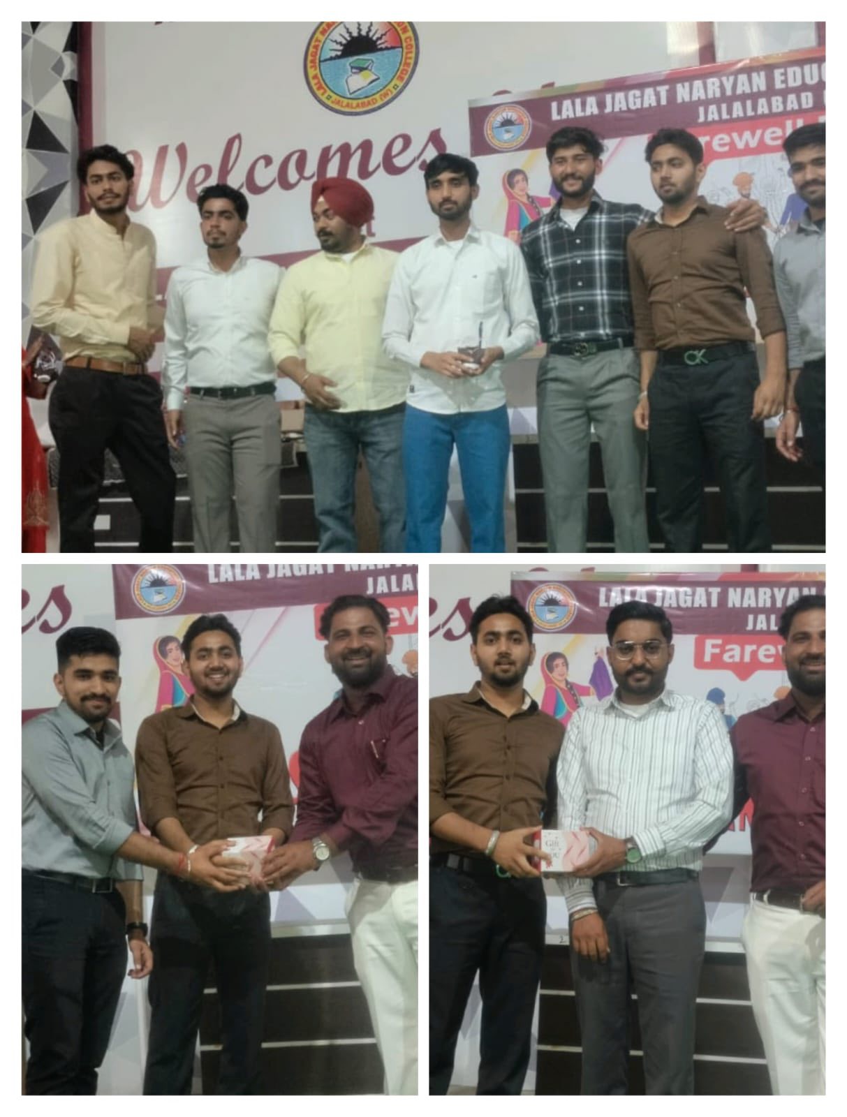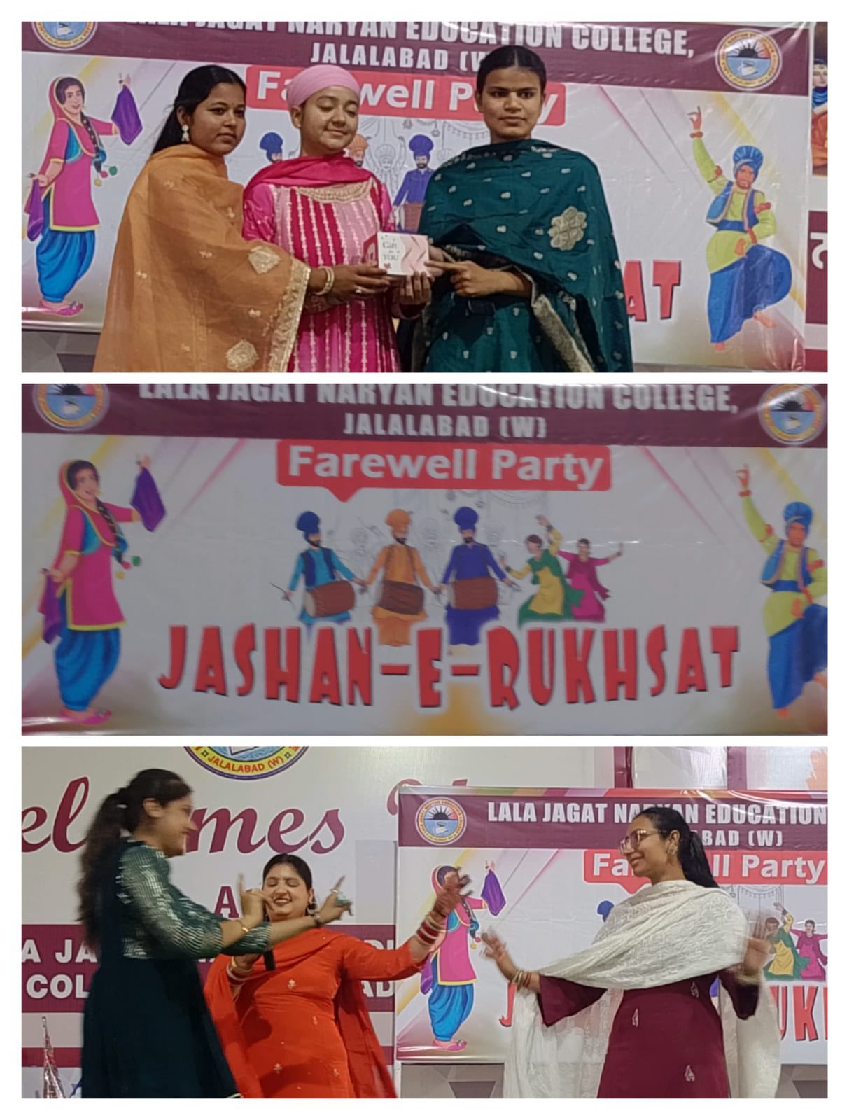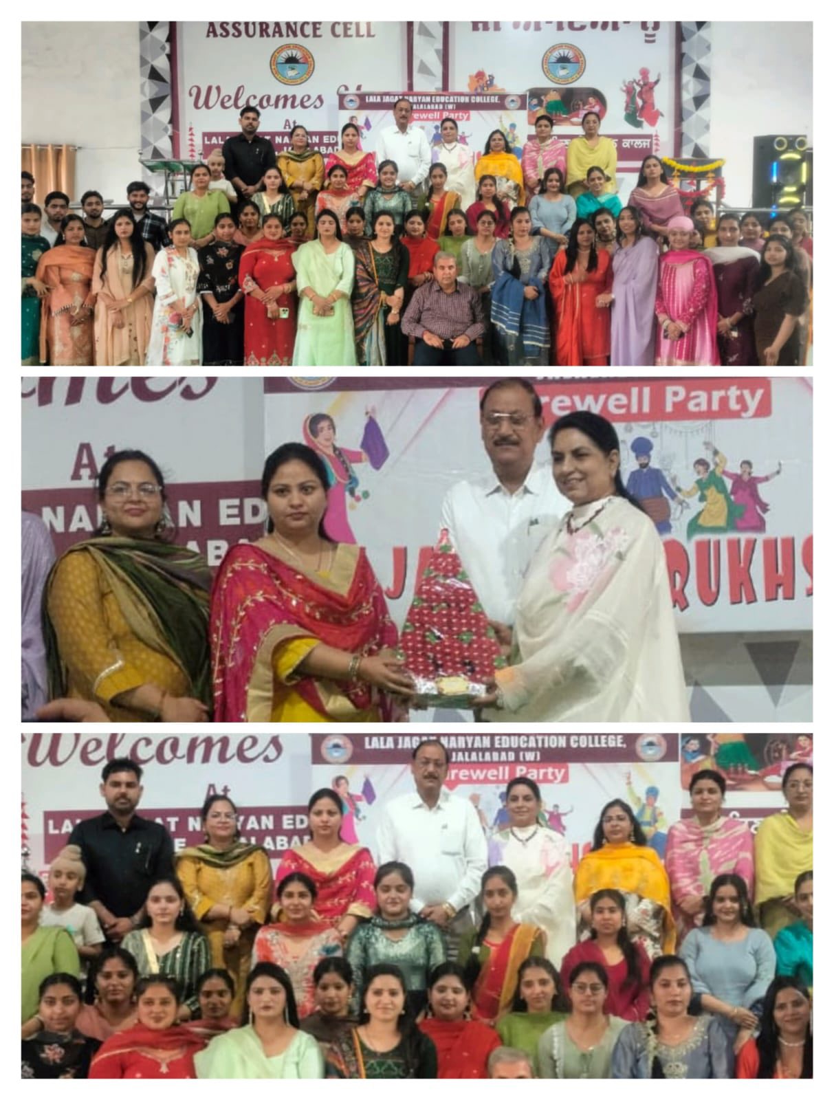 ਸਥਾਨਕ ਲਾਲਾ ਜਗਤ ਨਾਰਾਇਣ ਐਜੁਕੇਸ਼ਨ ਕਾਲਜ ਜਲਾਲਾਬਾਦ ਪੱਛਮੀ ਵਿਖੇ ਮੈਨੇਜਮੈਂਟ ਕਮੇਟੀ ਦੇ ਚੇਅਰਮੈਨ ਸ੍ਰੀ ਅਸ਼ੋਕ ਕੁਮਾਰ ਅਨੇਜਾ ਜੀ, ਪ੍ਰਧਾਨ ਸ੍ਰੀ ਪ੍ਰਦੀਪ ਕੁਮਾਰ ਚੁੱਘ ਜੀ, ਖਜ਼ਾਨਚੀ ਸ੍ਰੀ ਚੰਦਰ ਸ਼ੇਖਰ ਗੂੰਬਰ ਜੀ, ਸਿਖਿਆ ਸ਼ਾਸਤਰੀ ਸਰਦਾਰ ਗੁਰਬਖਸ਼ ਸਿੰਘ ਖੁਰਾਣਾ ਜੀ, ਪ੍ਰਿੰਸੀਪਲ ਡਾ ਨੀਤਿਕਾ ਜੀ ਦੀ ਯੋਗ ਅਗਵਾਈ ਅਧੀਨ ਕਾਲਜ ਵਿੱਚ ਅੰਤਿਮ ਸਾਲ ਦੇ ਵਿਦਿਆਰਥੀਆਂ ਡੀ. ਐੱਲ.ਐਂਡ 2023-2025 ਨੂੰ ਵਿਦਾਇਗੀ ਪਾਰਟੀ ਦੇਣ ਲਈ ਇੱਕ ਸ਼ਾਨਦਾਰ ਸਮਾਰੋਹ ਜਸ਼ਨ ਏ ਰੁਖ਼ਸਤ ਦਾ ਆਯੋਜਨ ਕੀਤਾ ਗਿਆ। ਇਸ ਸਮਾਰੋਹ ਦਾ ਮੁੱਖ ਮਕਸਦ ਸੀਨੀਅਰ ਵਿਦਿਆਰਥੀਆਂ ਨੂੰ ਉਨ੍ਹਾਂ ਦੇ ਸੁਨਹਿਰੀ ਭਵਿੱਖ ਲਈ ਸ਼ੁਭਕਾਮਨਾਵਾਂ ਦੇਣਾ ਸੀ। ਜਿਸ ਦੀ ਸ਼ੁਰੂਆਤ ਜੂਨੀਅਰ ਵਿਦਿਆਰਥੀਆਂ ਨੇ ਆਪਣੇ ਸੀਨੀਅਰ ਦਾ ਫੁੱਲਾ ਨਾਲ ਸਵਾਗਤ ਕਰਕੇ ਕੀਤੀ। ਇਸ ਦੌਰਾਨ ਰੰਗਮੰਚ ਪ੍ਰੈਰਗਾਮ ਪੇਸ਼ ਕੀਤੇ ਗਏ, ਜਿਸ ਵਿਚ ਗੀਤ ਨਾਚ, ਸ਼ੇਅਰ ਅਤੇ ਨਾਟਕ ਵਰਗੀਆਂ ਵੰਨਗੀਆਂ ਪੇਸ਼ ਕੀਤੀਆਂ ਗਈਆਂ ਵਿਦਿਆਰਥੀਆਂ ਨੇ ਕਾਲਜ ਵਿੱਚ ਬਿਤਾਏ ਆਪਣੇ ਪੁਰਾਣੇ ਦਿਨਾਂ ਨੂੰ ਯਾਦ ਕਰਦਿਆਂ ਆਪਣੇ ਤਜ਼ਰਬਿਆਂ ਨੂੰ ਸਾਂਝਾ ਕੀਤਾ। ਫਿਰ ਸੱਭਿਆਚਾਰ ਪ੍ਰੋਗਰਾਮ ਤੋਂ ਬਾਅਦ, ਸੀਨੀਅਰ ਵਿਦਿਆਰਥੀਆਂ ਨੂੰ ਮਿਸ ਐਂਡ ਮਿਸਟਰ ਫੇਅਰਵੈਲ ਵਰਗੇ ਖਿਤਾਬ ਨਾਲ ਸਨਮਾਨਿਤ ਕੀਤਾ ਗਿਆ। ਅੰਤ ਵਿੱਚ ਕਾਲਜ ਦੇ ਪ੍ਰਿੰਸੀਪਲ ਡਾਂ ਨੀਤਿਕਾ ਜੀ ਨੇ ਵਿਦਿਆਰਥੀਆਂ ਨੂੰ ਸੰਬੋਧਨ ਕਰਦਿਆਂ ਕਿਹਾ ਕਿ ਉਨ੍ਹਾਂ ਦੇ ਭਵਿੱਖ ਲਈ ਸ਼ੁਭਕਾਮਨਾਵਾਂ ਦਿੱਤੀਆਂ ਅਤੇ ਉਨ੍ਹਾਂ ਨੂੰ ਜੀਵਨ ਵਿੱਚ ਸਫਲਤਾ ਪ੍ਰਾਪਤ ਕਰਨ ਲਈ ਪ੍ਰੇਰਿਤ ਕੀਤਾ।