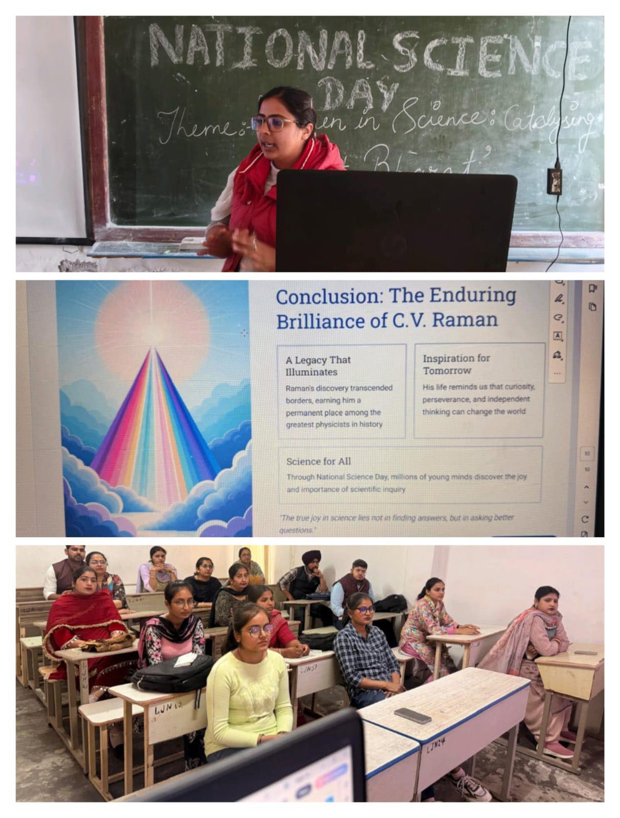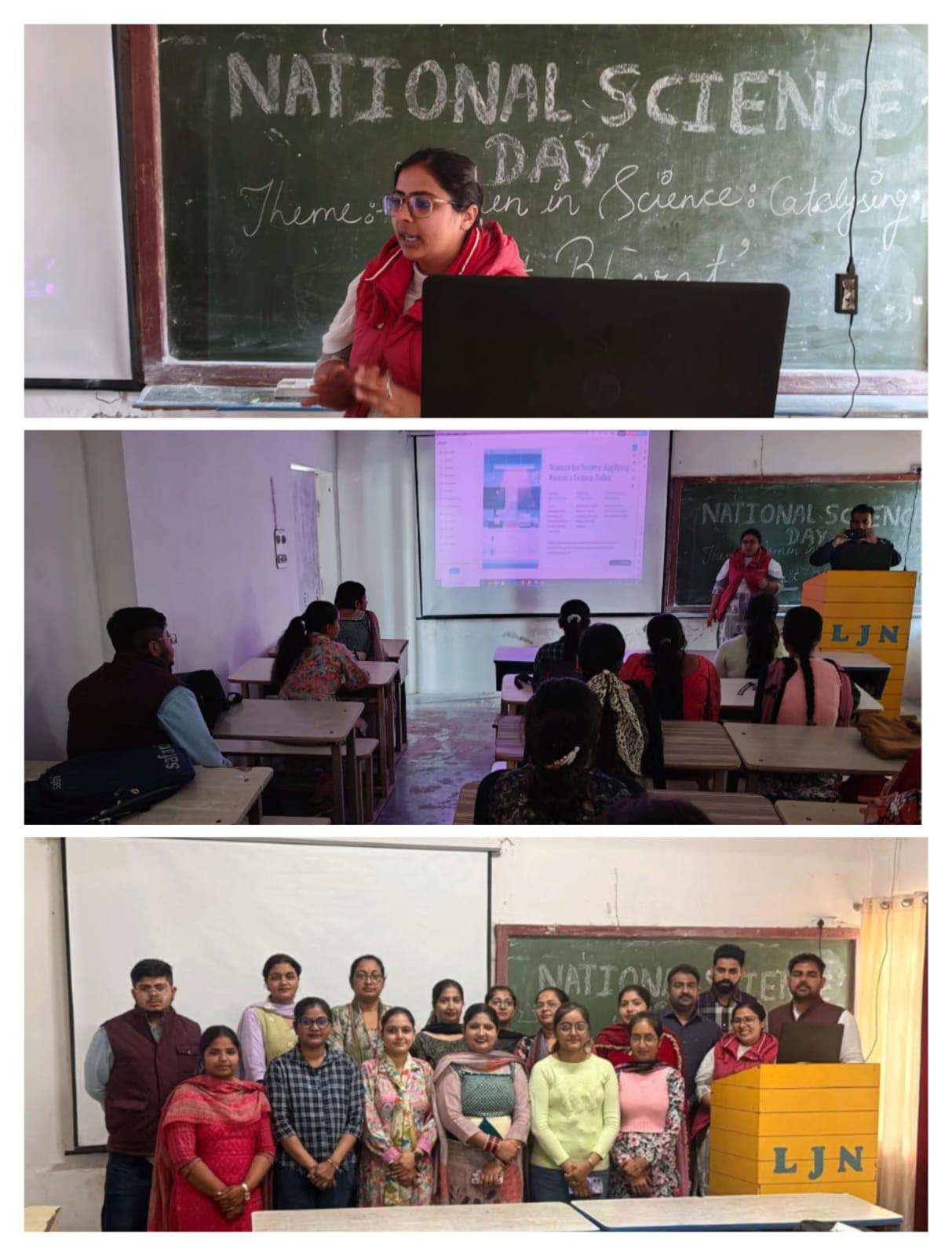 ਸਥਾਨਕ ਲਾਲਾ ਜਗਤ ਨਾਰਾਇਣ ਐਜੁਕੇਸ਼ਨ ਕਾਲਜ ਜਲਾਲਾਬਾਦ ਪੱਛਮੀ ਵਿਖੇ ਮੈਨੇਜਮੈਂਟ ਕਮੇਟੀ ਦੇ ਚੇਅਰਮੈਨ ਸ੍ਰੀ ਅਸ਼ੋਕ ਕੁਮਾਰ ਅਨੇਜਾ ਜੀ, ਪ੍ਰਧਾਨ ਸ੍ਰੀ ਪ੍ਰਦੀਪ ਕੁਮਾਰ ਚੁੱਘ ਜੀ, ਖਜ਼ਾਨਚੀ ਸ੍ਰੀ ਚੰਦਰ ਸ਼ੇਖਰ ਗੂੰਬਰ ਜੀ, ਸਿਖਿਆ ਸ਼ਾਸਤਰੀ ਸਰਦਾਰ ਗੁਰਬਖਸ਼ ਸਿੰਘ ਖੁਰਾਣਾ ਜੀ, ਪ੍ਰਿੰਸੀਪਲ ਡਾ ਨੀਤਿਕਾ ਜੀ ਦੀ ਯੋਗ ਅਗਵਾਈ ਹੇਠ 28/02/2026 ਨੂੰ ਕਾਲਜ ਵਿੱਚ ਰਾਸ਼ਟਰੀ ਵਿਗਿਆਨ ਦਿਵਸ ਮਨਾਇਆ ਗਿਆ। ਜਿਸ ਦਾ ਮੁੱਖ ਵਿਸ਼ਾ ਵਿਗਿਆਨ ਵਿੱਚ ਅਰੌਤਾ ਵਿਕਸਿਤ ਭਾਰਤ ਲਈ ਉਤਪ੍ਰੇਰਕ ਹਨ ਜੋਂ ਭਾਰਤ ਦੇ ਵਿਕਸਿਤ ਰਾਸ਼ਟਰ ਬਣਨ ਦੇ ਸੁਪਨੇ ਵਿੱਚ ਔਰਤਾਂ ਦੀ ਭੂਮਿਕਾ ਨੂੰ ਉਜਾਗਰ ਕਰਦਾ ਹੈ। ਇਸ ਮੌਕੇ ਤੇ ਕਾਲਜ ਦੇ ਪ੍ਰਿੰਸੀਪਲ ਡਾਂ ਨੀਤਿਕਾ ਜੀ ਵਿਦਿਆਰਥੀਆਂ ਨੂੰ ਰਾਸ਼ਟਰੀ ਵਿਗਿਆਨ ਦਿਵਸ ਦੀ ਮਹੱਤਤਾ ਬਾਰੇ ਦੱਸਿਆ ਹੋਏ ਕਿਹਾ ਕਿ ਇਹ ਦਿਵਸ਼ ਵਿਗਿਆਨੀ ਸਰ ਸੀ ਵੀ ਦੁਆਰਾ ( ਰਮਨ ਪ੍ਰਭਾਵ ਦੀ ਖੋਜ ਦੀ ਯਾਦ ਵਿੱਚ ਮਨਾਇਆ ਜਾਂਦਾ ਹੈ । ਜਿਸ ਦਾ ਉਦੇਸ਼ ਮਾਨਵ ਕਲਿਆਣ ਲਈ ਵਿਗਿਆਨ ਦੇ ਹਰ ਮਹੱਤਵ ਨੂੰ ਉਜਾਗਰ ਕਰਨਾ ਤੇ ਹਰ ਖੇਤਰ ਵਿੱਚ ਵਿਕਾਸ ਲਈ ਨਵੀਆਂ ਤਕਨੀਕਾਂ ਨੂੰ ਲਾਗੂ ਕਰਨ ਲਈ ਹੈ। ਇਸ ਮੌਕੇ ਸਾਇੰਸ ਸਿੱਖਿਆ ਵਿਭਾਗ ਦੇ ਸਹਾਇਕ ਪ੍ਰੋਫ਼ੈਸਰ ਰਿੰਕਲ ਨੇ ਵਿਦਿਆਰਥੀਆਂ ਨਾਲ ਰਾਸ਼ਟਰੀ ਵਿਗਿਆਨ ਬਾਰੇ ਜਾਣਕਾਰੀ ਸਾਂਝੀ ਕੀਤੀ।