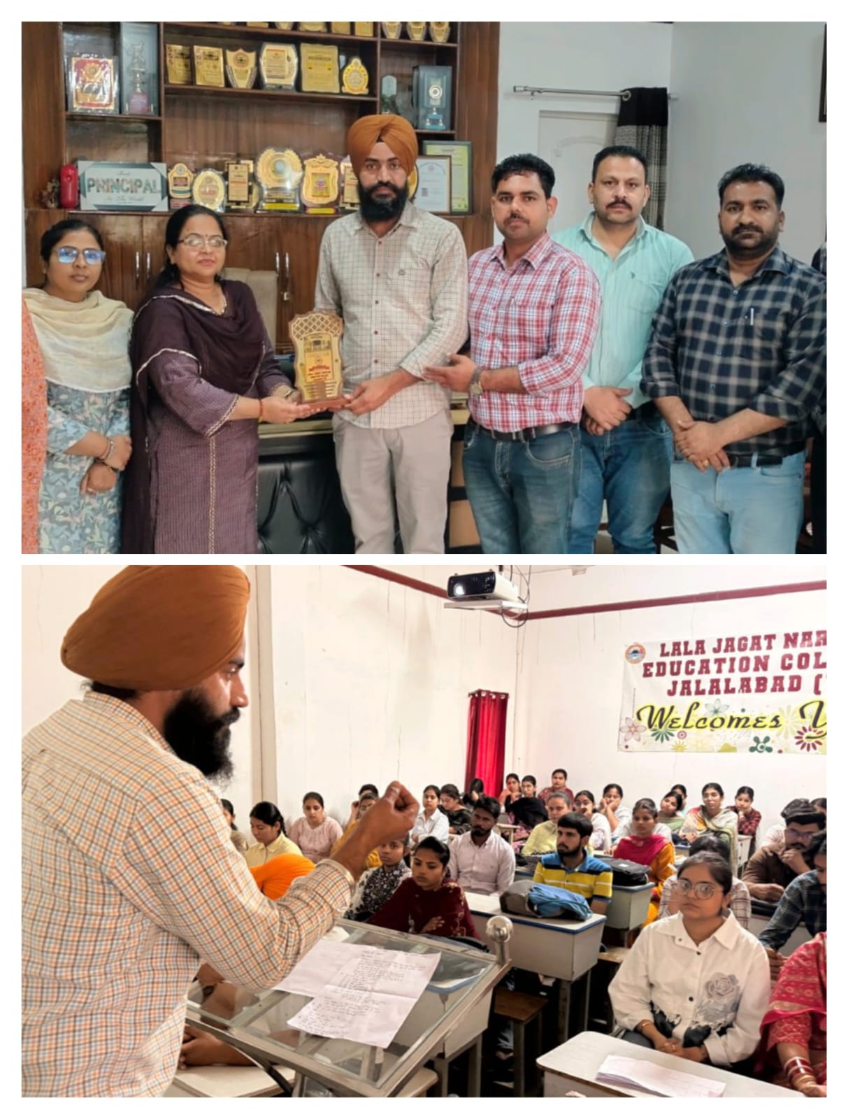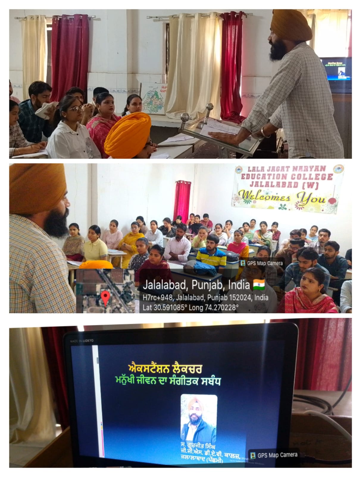 ਸਥਾਨਕ ਲਾਲਾ ਜਗਤ ਨਾਰਾਇਣ ਐਜੁਕੇਸ਼ਨ ਕਾਲਜ ਜਲਾਲਾਬਾਦ ਪੱਛਮੀ ਵਿਖੇ ਮੈਨੇਜਮੈਂਟ ਕਮੇਟੀ ਦੇ ਚੇਅਰਮੈਨ ਸ੍ਰੀ ਅਸ਼ੋਕ ਕੁਮਾਰ ਅਨੇਜਾ ਜੀ, ਪ੍ਰਧਾਨ ਸ੍ਰੀ ਪ੍ਰਦੀਪ ਕੁਮਾਰ ਚੁੱਘ ਜੀ, ਖਜ਼ਾਨਚੀ ਸ੍ਰੀ ਚੰਦਰ ਸ਼ੇਖਰ ਗੂੰਬਰ ਜੀ, ਸਿਖਿਆ ਸ਼ਾਸਤਰੀ ਸਰਦਾਰ ਗੁਰਬਖਸ਼ ਸਿੰਘ ਖੁਰਾਣਾ ਜੀ, ਪ੍ਰਿੰਸੀਪਲ ਡਾ ਨੀਤਿਕਾ ਜੀ ਦੀ ਯੋਗ ਅਗਵਾਈ ਅਧੀਨ ਕਾਲਜ ਵਿੱਖੇ ਮਨੁੱਖੀ ਜੀਵਨ ਦਾ ਸੰਗੀਤਕ ਸੰਬੰਧ ਤੇ ਐਕਸਟੈਨਸ਼ਨ ਲੈਕਚਰ ਕਰਵਾਇਆ ਗਿਆ। ਜਿਸ ਵਿੱਚ ਸਹਾਇਕ ਪ੍ਰੋਫ਼ੈਸਰ ਸਰਦਾਰ ਗੁਰਜੀਤ ਸਿੰਘ ਜੀ. ਜੀ. ਐਸ ਡੀ. ਏ. ਵੀ ਕਾਲਜ ਜਲਾਲਾਬਾਦ ਪੱਛਮੀ ਤੇ ਵਿਸ਼ੇਸ਼ ਤੌਰ ਤੇ ਪਹੁੰਚੇ। ਉਹਨਾਂ ਨੇ ਮਨੁੱਖੀ ਜੀਵਨ ਵਿੱਚ ਸੰਗੀਤ ਦੇ ਮੱਹਤਵ ਤੇ ਪ੍ਰਭਾਵ ਬਾਰੇ ਵਿਦਿਆਰਥੀਆਂ ਨਾਲ ਜਾਣਕਾਰੀ ਸਾਂਝੀ ਕੀਤੀ। ਉਹਨਾਂ ਨੇ ਕਿਹਾ ਕਿ ਸੰਗੀਤ ਸਿਰਫ਼ ਮਨੋਰੰਜਨ ਦਾ ਸਾਧਨ ਹੀ ਨਹੀਂ ਸਗੋਂ ਇਹ ਰੂਹ ਦੀ ਖੁਰਾਕ, ਮਾਨਸਿਕ ਸ਼ਾਂਤੀ ਅਤੇ ਭਾਵਨਾਵਾਂ ਨੂੰ ਪ੍ਰਗਟ ਕਰਨ ਦਾ ਇੱਕ ਸ਼ਕਤੀਸ਼ਾਲੀ ਮਾਧਿਅਮ ਹੈ ਜਿਵੇਂ ਪਿਆਰ, ਖੁਸ਼ੀ, ਗਮੀ ਆਦਿ। ਸੰਗੀਤ ਜੀਵਨ ਨੂੰ ਬਿਹਤਰ ਬਣਾਉਣ ਵਿੱਚ ਅਹਿਮ ਭੂਮਿਕਾ ਨਿਭਾਉਂਦਾ ਹੈ। ਇਸ ਦੌਰਾਨ ਪ੍ਰਿੰਸੀਪਲ ਡਾ ਨੀਤਿਕਾ ਜੀ ਨੇ ਸਰਦਾਰ ਗੁਰਜੀਤ ਸਿੰਘ ਜੀ ਨੂੰ ਸਨਮਾਨ ਚਿੰਨ੍ਹ ਦੇ ਕੇ ਧੰਨਵਾਦ ਕੀਤਾ ਇਸ ਮੌਕੇ ਤੇ ਕਾਲਜ ਦਾ ਸਮੂਹ ਸਟਾਫ ਮੈਂਬਰ ਤੇ ਵਿਦਿਆਰਥੀ ਮੌਜੂਦ ਸਨ।