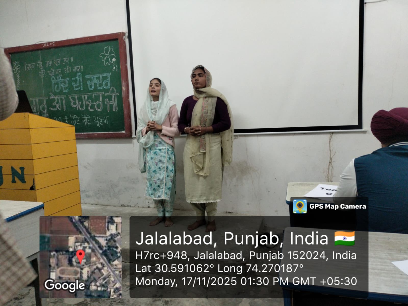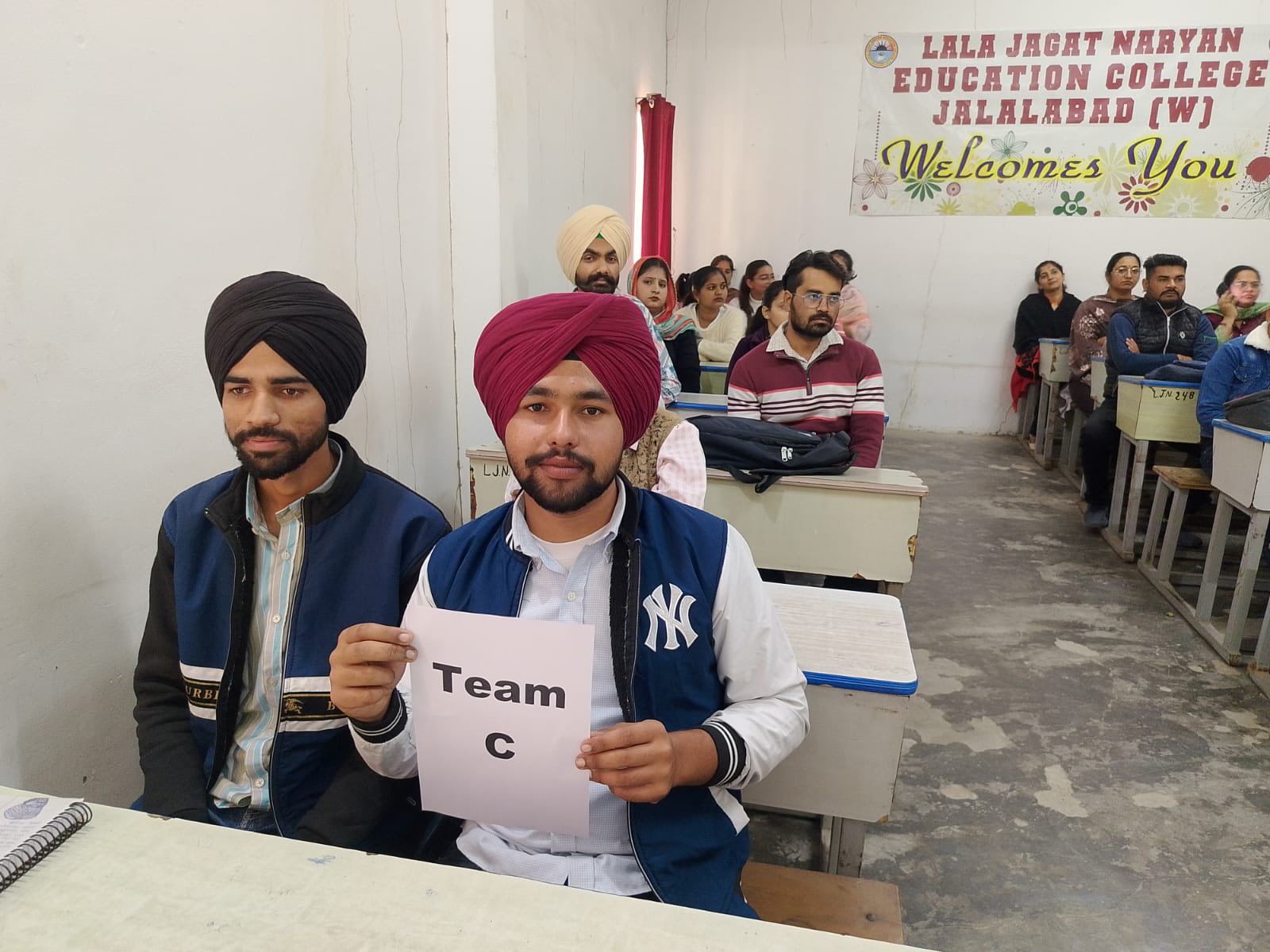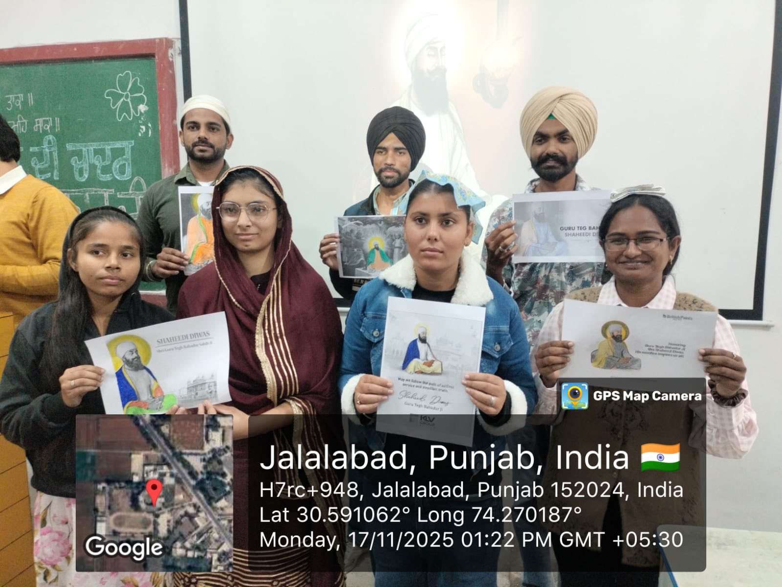 ਸਥਾਨਕ ਲਾਲਾ ਜਗਤ ਨਾਰਾਇਣ ਐਜੁਕੇਸ਼ਨ ਕਾਲਜ ਜਲਾਲਾਬਾਦ ਪੱਛਮੀ ਵਿਖੇ ਮੈਨੇਜਮੈਂਟ ਕਮੇਟੀ ਦੇ ਚੇਅਰਮੈਨ ਸ੍ਰੀ ਅਸ਼ੋਕ ਕੁਮਾਰ ਅਨੇਜਾ ਜੀ, ਪ੍ਰਧਾਨ ਸ੍ਰੀ ਪ੍ਰਦੀਪ ਕੁਮਾਰ ਚੁੱਘ ਜੀ, ਖਜ਼ਾਨਚੀ ਸ੍ਰੀ ਚੰਦਰ ਸ਼ੇਖਰ ਗੂੰਬਰ ਜੀ, ਸਿਖਿਆ ਸ਼ਾਸਤਰੀ ਸਰਦਾਰ ਗੁਰਬਖਸ਼ ਸਿੰਘ ਖੁਰਾਣਾ ਜੀ, ਪ੍ਰਿੰਸੀਪਲ ਡਾ ਨੀਤਿਕਾ ਜੀ ਦੀ ਯੋਗ ਅਗਵਾਈ ਹੇਠ ਮਿਤੀ 17 ਨਵੰਬਰ 2025 ਨੂੰ ਸ੍ਰੀ ਗੁਰੂ ਤੇਗ ਬਹਾਦਰ ਜੀ ਦੇ ਜੀਵਨ ਅਤੇ ਸ਼ਹਾਦਤ ਦੇ ਸਬੰਧ ਵਿੱਚ ਉਹਨਾਂ ਦੀ 350ਵੀ ਸ਼ਹਾਦਤ ਦੇ ਵਰੇਗੰਢ ਮੌਕੇ ਤੇ ਪੋਸਟਰ ਮੇਕਿੰਗ ਅਤੇ ਪ੍ਰਸ਼ਨਾਵਲੀ ਪ੍ਰਤੀਯੋਗਤਾ ਦਾ ਆਯੋਜਨ ਕੀਤਾ ਗਿਆ। ਇਸ ਵਿਚ ਵਿਦਿਆਰਥੀਆਂ ਤੋਂ ਸ੍ਰੀ ਗੁਰੂ ਤੇਗ ਬਹਾਦਰ ਜੀ ਦੇ ਜੀਵਨ ਨਾਲ ਸਬੰਧਤ ਪ੍ਰਸ਼ਨ ਪੁੱਛੇ ਗਏ। ਅਤੇ ਇਸ ਦੇ ਨਾਲ ਵਿਦਿਆਰਥੀਆਂ ਨੇ ਗੁਰੂ ਜੀ ਦੇ ਜੀਵਨ ਨਾਲ ਸਬੰਧਤ ਪੋਸਟਰ ਬਣਾਏ। ਇਸ ਪ੍ਰਤੀਯੋਗਤਾ ਵਿਚ ਸਾਰੇ ਵਿਦਿਆਰਥੀਆਂ ਅਤੇ ਅਧਿਆਪਕਾਂ ਦੁਆਰਾ ਵੱਧ ਚੜ੍ਹ ਕੇ ਹਿੱਸਾ ਲਿਆ ਗਿਆ। ਇਸ ਮੌਕੇ ਤੇ ਕਾਲਜ ਦੇ ਪ੍ਰਿੰਸੀਪਲ ਡਾਂ ਨੀਤਿਕਾ ਜੀ ਨੇ ਵਿਦਿਆਰਥੀਆਂ ਨੂੰ ਭਵਿੱਖ ਵਿਚ ਹੋਣ ਵਾਲੇ ਇਸ ਤਰ੍ਹਾਂ ਦੇ ਮੁਕਾਬਲਿਆਂ ਵਿੱਚ ਹਿੱਸਾ ਲੈਣ ਲਈ ਪ੍ਰੇਰਿਤ ਕੀਤਾ ਅਤੇ ਗੁਰੂ ਜੀ ਦੇ ਕਹੇ ਅਨੁਸਾਰ ਜੀਵਨ ਜਾਚ ਅਪਣਾਉਣ ਲਈ ਕਿਹਾ।