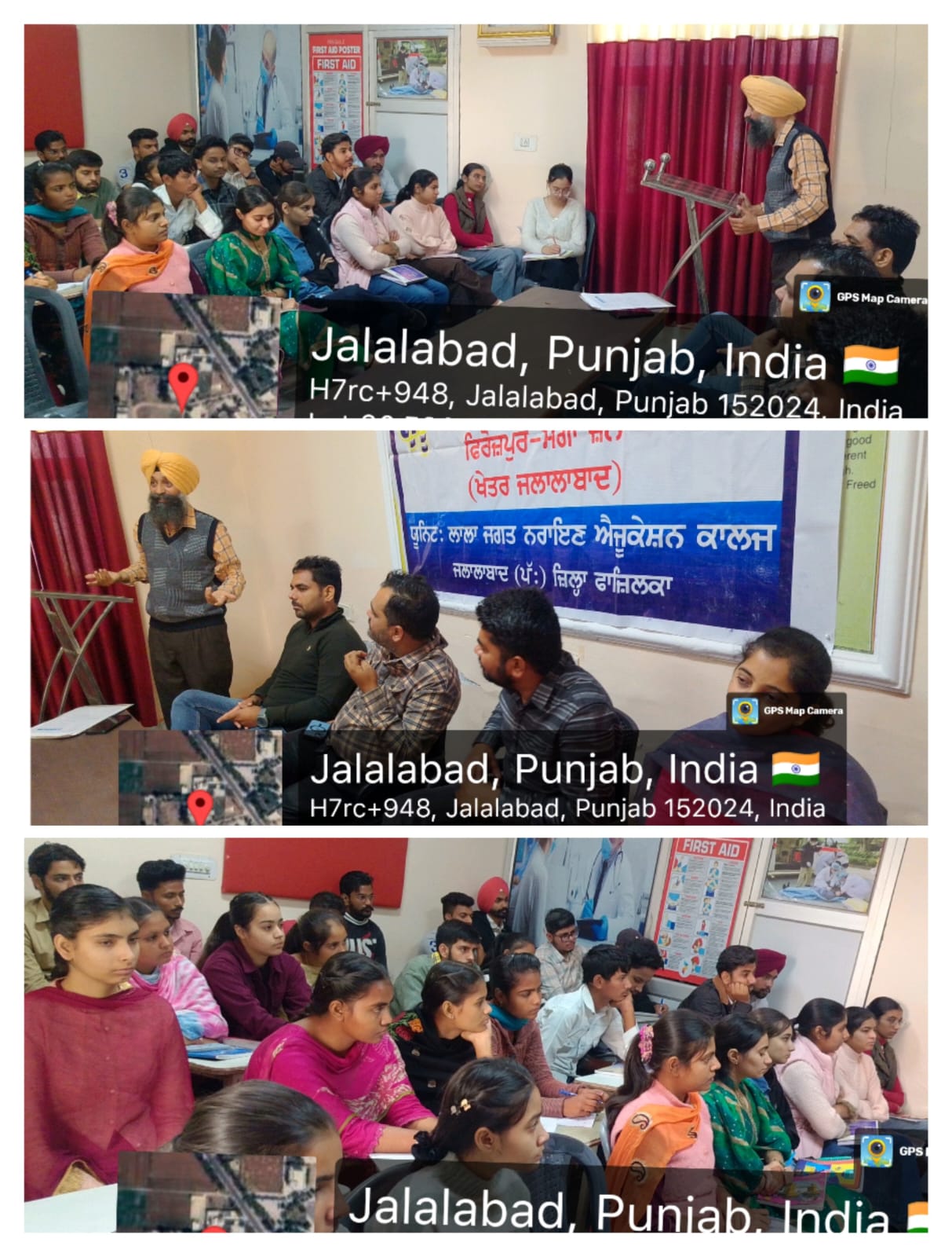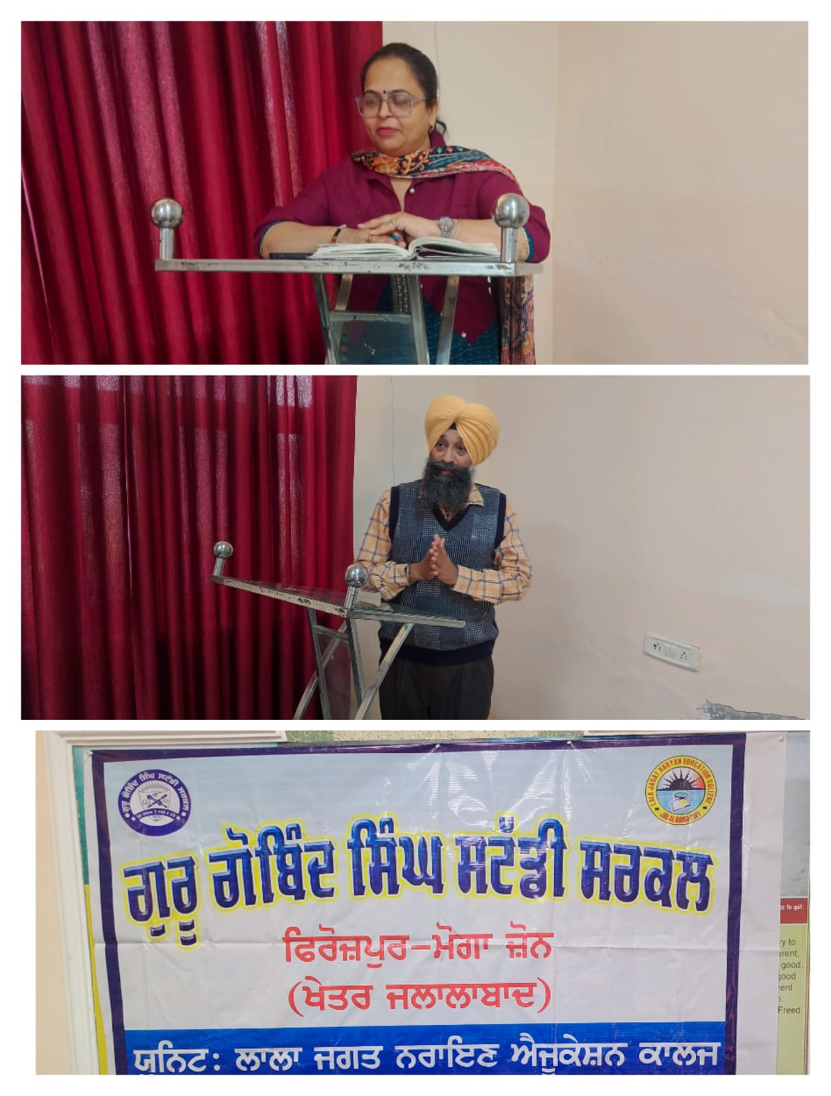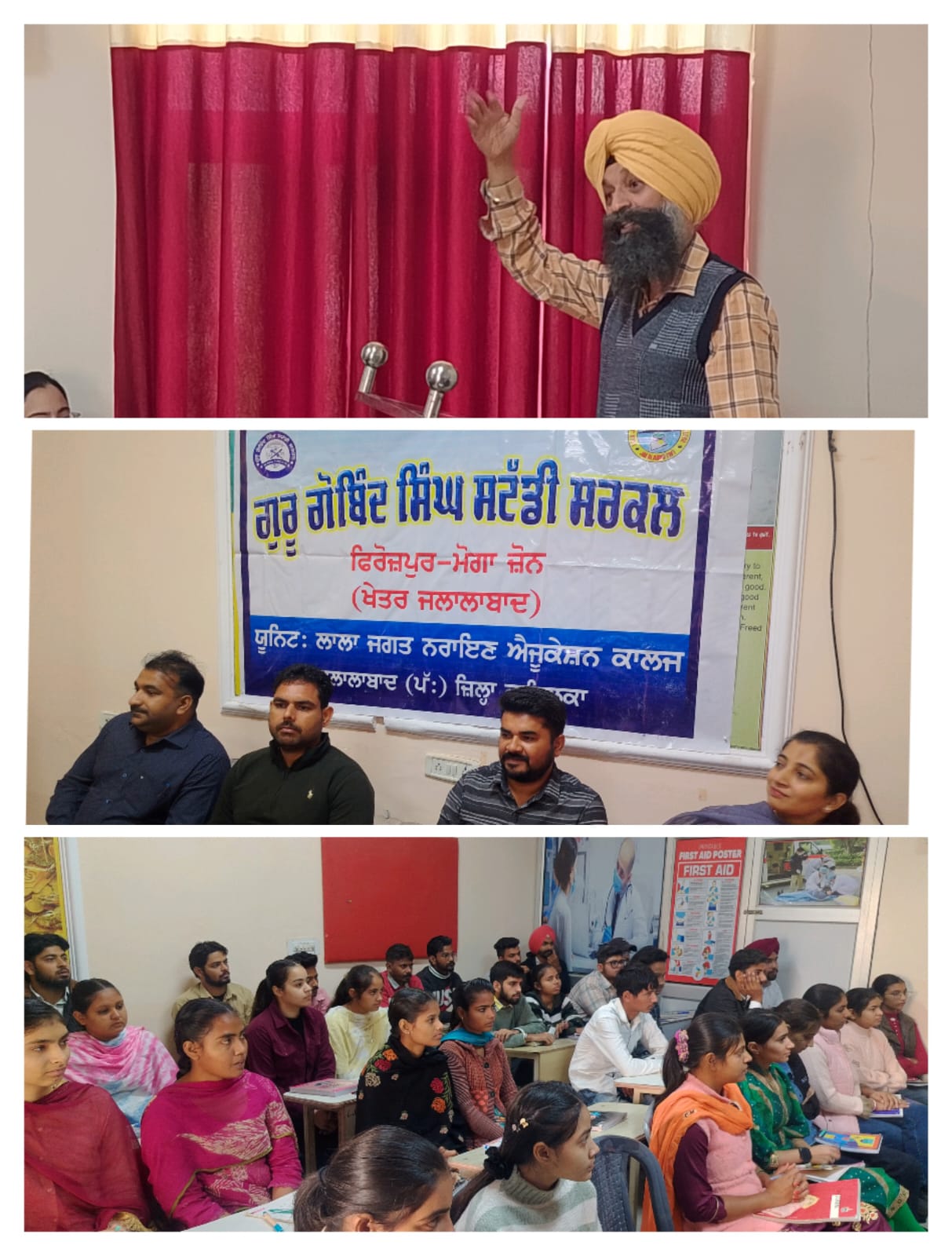 ਸਥਾਨਕ ਲਾਲਾ ਜਗਤ ਨਾਰਾਇਣ ਐਜੁਕੇਸ਼ਨ ਕਾਲਜ ਜਲਾਲਾਬਾਦ ਪੱਛਮੀ ਵਿਖੇ ਮੈਨੇਜਮੈਂਟ ਕਮੇਟੀ ਦੇ ਚੇਅਰਮੈਨ ਸ੍ਰੀ ਅਸ਼ੋਕ ਕੁਮਾਰ ਅਨੇਜਾ ਜੀ, ਪ੍ਰਧਾਨ ਸ੍ਰੀ ਪ੍ਰਦੀਪ ਕੁਮਾਰ ਚੁੱਘ ਜੀ, ਖਜ਼ਾਨਚੀ ਸ੍ਰੀ ਚੰਦਰ ਸ਼ੇਖਰ ਗੂੰਬਰ ਜੀ, ਸਿਖਿਆ ਸ਼ਾਸਤਰੀ ਸਰਦਾਰ ਗੁਰਬਖਸ਼ ਸਿੰਘ ਖੁਰਾਣਾ ਜੀ, ਪ੍ਰਿੰਸੀਪਲ ਡਾ ਨੀਤਿਕਾ ਜੀ ਦੀ ਯੋਗ ਅਗਵਾਈ ਹੇਠ ਮਿਤੀ 11 ਨਵੰਬਰ 2025 ਨੂੰ ਸ੍ਰੀ ਗੁਰੂ ਤੇਗ ਬਹਾਦਰ ਜੀ ਦੇ ਜੀਵਨ ਅਤੇ ਸ਼ਹਾਦਤ ਦੇ ਸਬੰਧ ਵਿੱਚ ਵਿੱਚ ਉਹਨਾਂ ਦੀ 350 ਵੀ ਸ਼ਹਾਦਤ ਵਰ੍ਹੇਗੰਢ ਦੇ ਮੌਕੇ ਤੇ ਸੈਮੀਨਾਰ ਦਾ ਆਯੋਜਨ ਕੀਤਾ ਗਿਆ। ਇਸ ਸੈਮੀਨਾਰ ਦੇ ਮੁੱਖ ਵਕਤਾ ਸਰਦਾਰ ਨਰਿੰਦਰਪਾਲ ਸਿੰਘ ਜੀ ਲੈਕਚਰਾਰ ਗੋਰਮਿੰਟ ਸਕੂਲ ਲੜਕੇ ਗੁਰੂਹਰਸਹਾਏ ਅਡੀਸ਼ਨਲ ਚੀਫ਼ ਸਕੱਤਰ ਅਕਾਦਮਿਕ ਗੁਰੂ ਗੋਬਿੰਦ ਸਿੰਘ ਸਟੱਡੀ ਸਰਕਲ ਸਨ। ਉਹਨਾਂ ਨੇ ਵਿਦਿਆਰਥੀਆਂ ਨੂੰ ਸ੍ਰੀ ਗੁਰੂ ਤੇਗ ਬਹਾਦਰ ਜੀ ਦੇ ਜੀਵਨ ਅਤੇ ਬਲਿਦਾਨ ਬਾਰੇ ਦੱਸਿਆ ਅਤੇ ਬਾਣੀ ਦੀਆਂ ਤੁਕਾਂ ਰਾਹੀਂ ਜੀਵਨ ਨੂੰ ਸੇਧ ਦੇਣ ਵਾਲੀਆਂ ਗੱਲਾਂ ਦੱਸੀਆਂ। ਅੰਤ ਵਿੱਚ ਕਾਲਜ ਦੇ ਪ੍ਰਿੰਸੀਪਲ ਡਾਂ ਨੀਤਿਕਾ ਜੀ ਨੇ ਸਰਦਾਰ ਨਰਿੰਦਰਪਾਲ ਸਿੰਘ ਜੀ ਦਾ ਧੰਨਵਾਦ ਕੀਤਾ ਅਤੇ ਕਿਹਾ ਕਿ ਭਵਿੱਖ ਵਿੱਚ ਅਜਿਹੇ ਸੈਮੀਨਾਰ ਕਰਵਾਏ ਜਾਣਗੇ ਤਾਂ ਜੋਂ ਵਿਦਿਆਰਥੀਆ ਦੇ ਜੀਵਨ ਨੂੰ ਸੇਧ ਮਿਲ ਸਕੇ। ਇਸ ਸੈਮੀਨਾਰ ਦਾ ਸੰਚਾਲਨ ਸਹਾਇਕ ਪ੍ਰੋਫ਼ੈਸਰ ਅਮਨ ਝਾਂਬ ਦੀ ਦੇਖ ਰੇਖ ਵਿੱਚ ਹੋਇਆ।